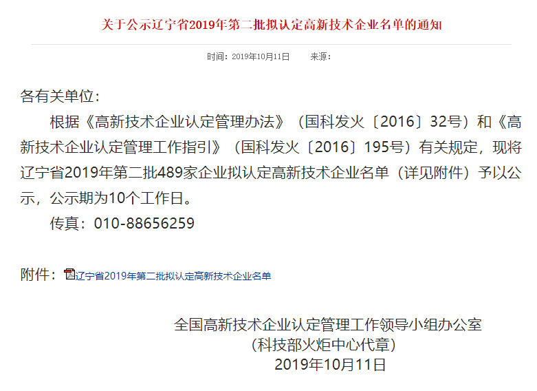 我公司進(jìn)入遼寧省第二批擬認(rèn)定高新技術(shù)企業(yè)名單